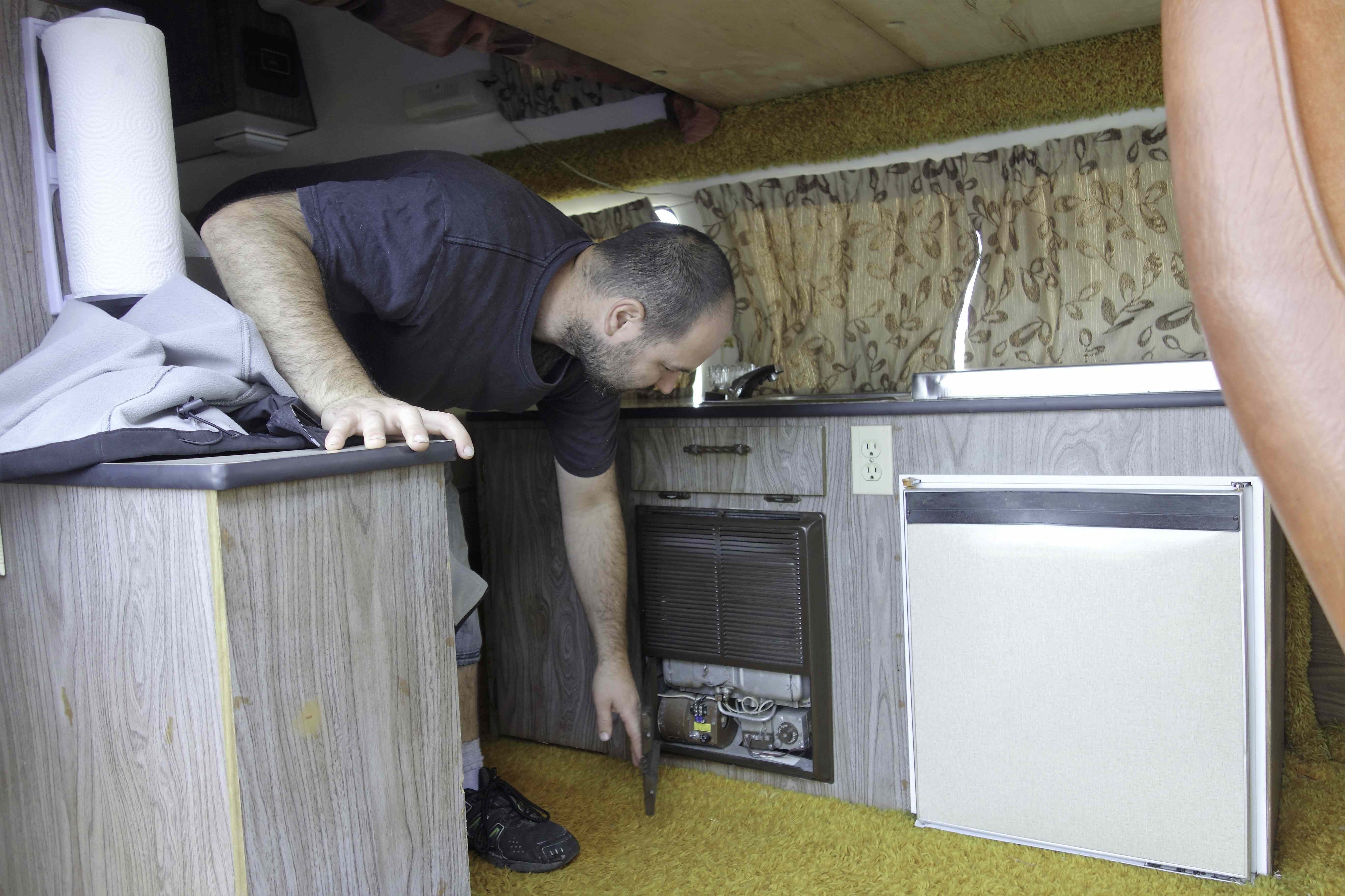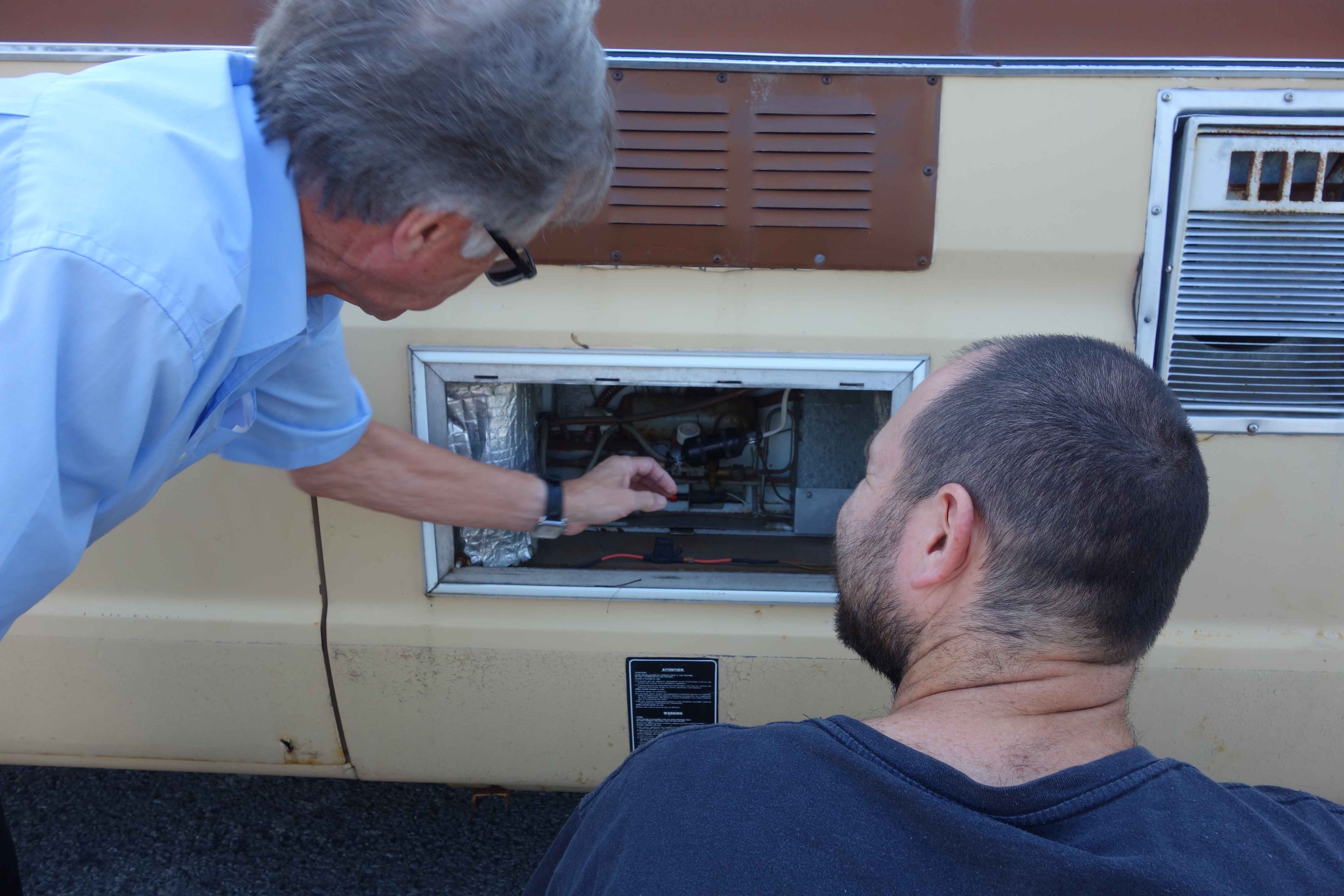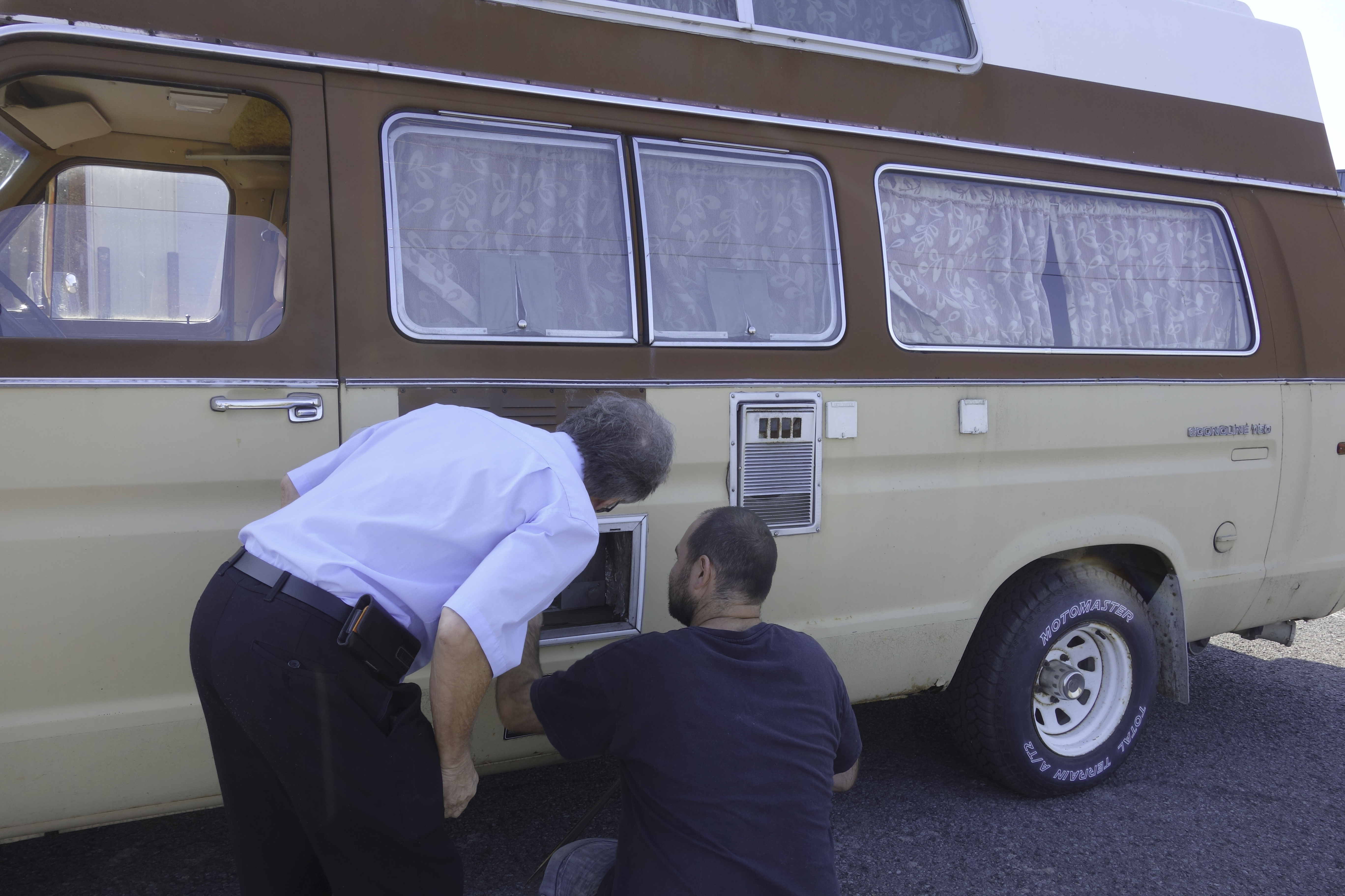 We then had the opportunity to walk around the camper and exclaim at all the memories this nice surprise was triggering for us. As was to be expected with camper fans, the conversation between Steeve and Lucien quickly lead to technical characteristics, and they naturally walked and stopped in front of the refrigerator mechanical access door. Being Lucien’s daughter, I have many childhood memories of camping enthusiasts having lively conversations, all with their nose into the Dometic refrigerator access door.